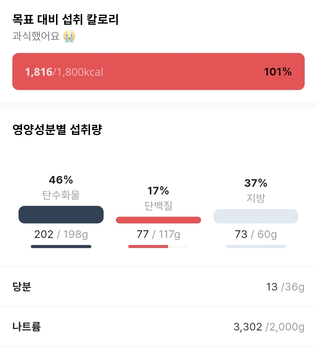 - ํ์ํ๋ฌผ 198g(44%) + ๋จ๋ฐฑ์ง 117g(26%) + ์ง๋ฐฉ 60g(30%) = 1800kcal